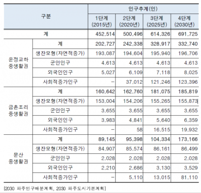 이중 인구추계는 2단계인 2020년에 인구 50만명, 3단계 2015년에는 61만명, 4단계 2030년에는 69만명으로 계획했으며 문산중생활권의 인구가 가장 많이 증가하는 것으로 목표로 잡았다.[5]