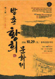 제1회 방촌황희문화제는 2016.10.29일 문산 방촌선생유적지에서 유림과 학생 등 시민들과 관광객 등 2천여명이 참석한 가운데 개최됐다.