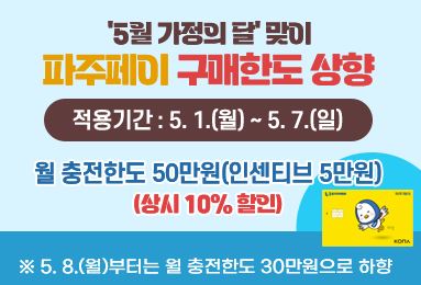 파주시는 2023.5.1일부터 5.7일까지 일주일간 월 충전한도를 1인당 30만원에서 50만원으로 20만원을 상향하는 이벤트를 추진한다.